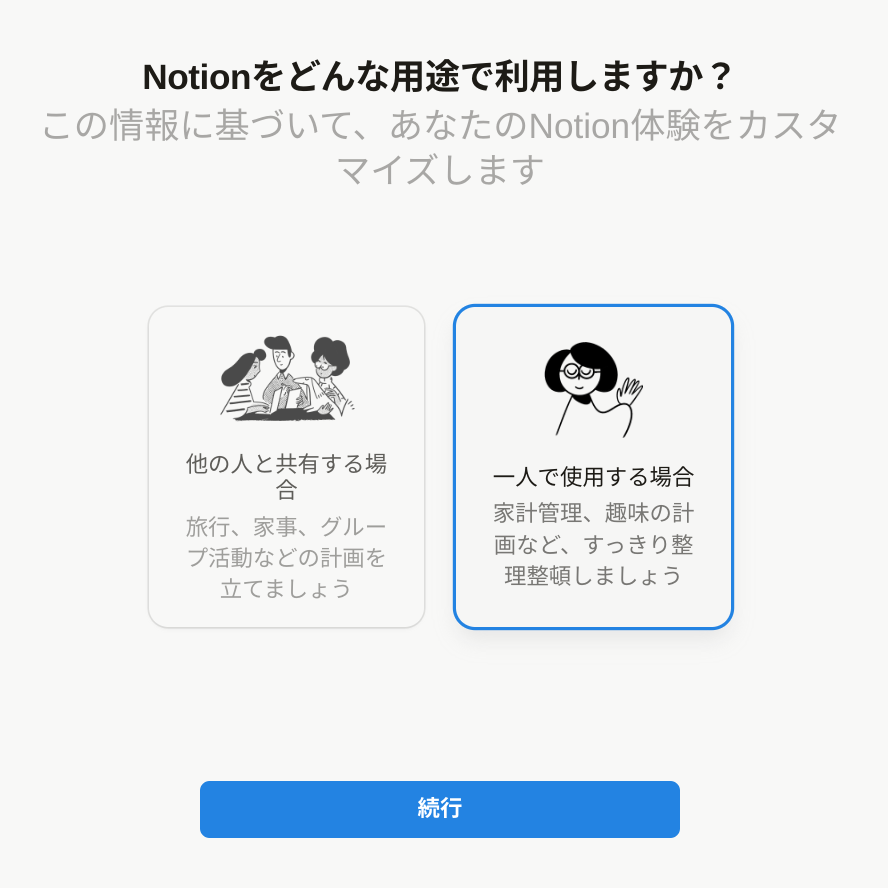 またまた、Notionをどんな用途で使用しますか?画面になりました。「一人で使用する場合」を選択しました。